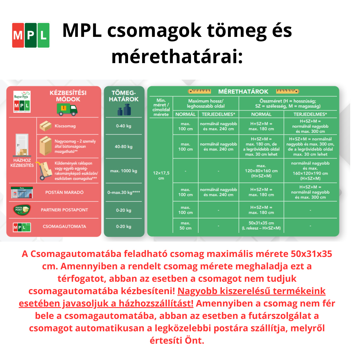 A Csomagautomatába feladható csomag maximális mérete 50x31x35 cm. Amennyiben a rendelt csomag mérete meghaladja ezt a térfogatot, abban az esetben a csomagot nem tudjuk csomagautomatába kézbesíteni! Nagyobb kiszerelésű termékeink esetében javasoljuk a házhozszállítást! Amennyiben a csomag nem fér bele a csomagautomatába, abban az esetben a futárszolgálat a csomagot automatikusan a legközelebbi postára szállítja, melyről értesíti Önt.